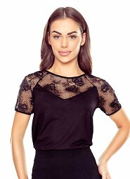 - dekolt i rękawy zdobi efektowna koronka o kwiatowym princie