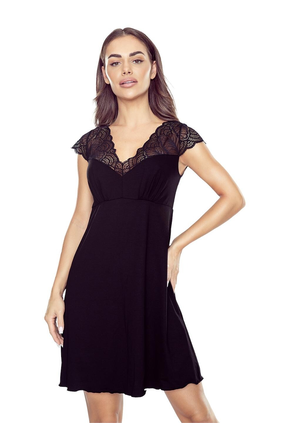 - dekolt, rękawki i plecy z ażurowej koronki