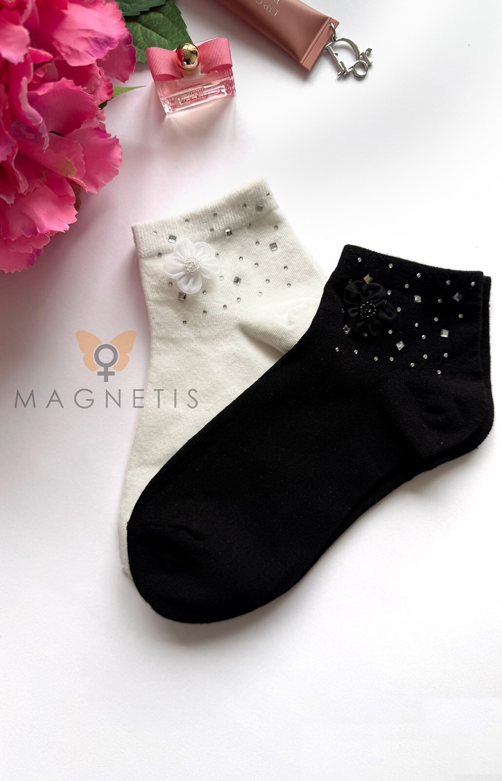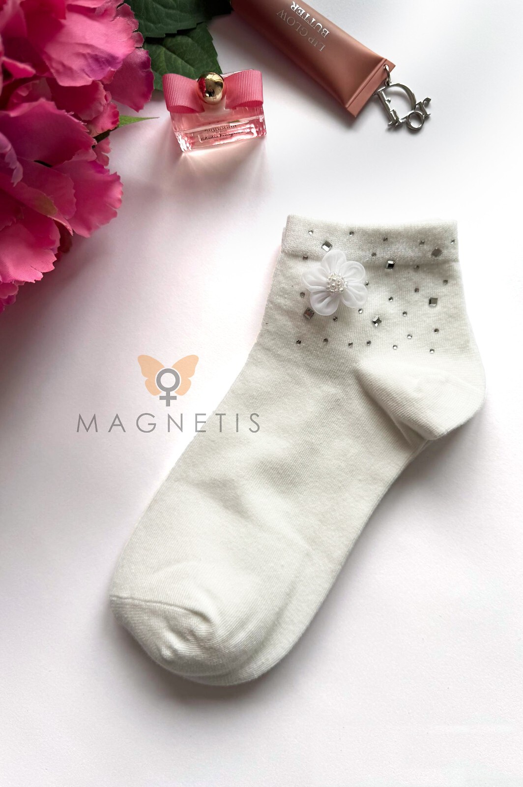 - cholewkę zdobią połyskujące cyrkonie i delikatny kwiatuszek z szyfonu