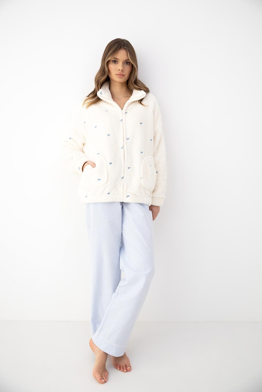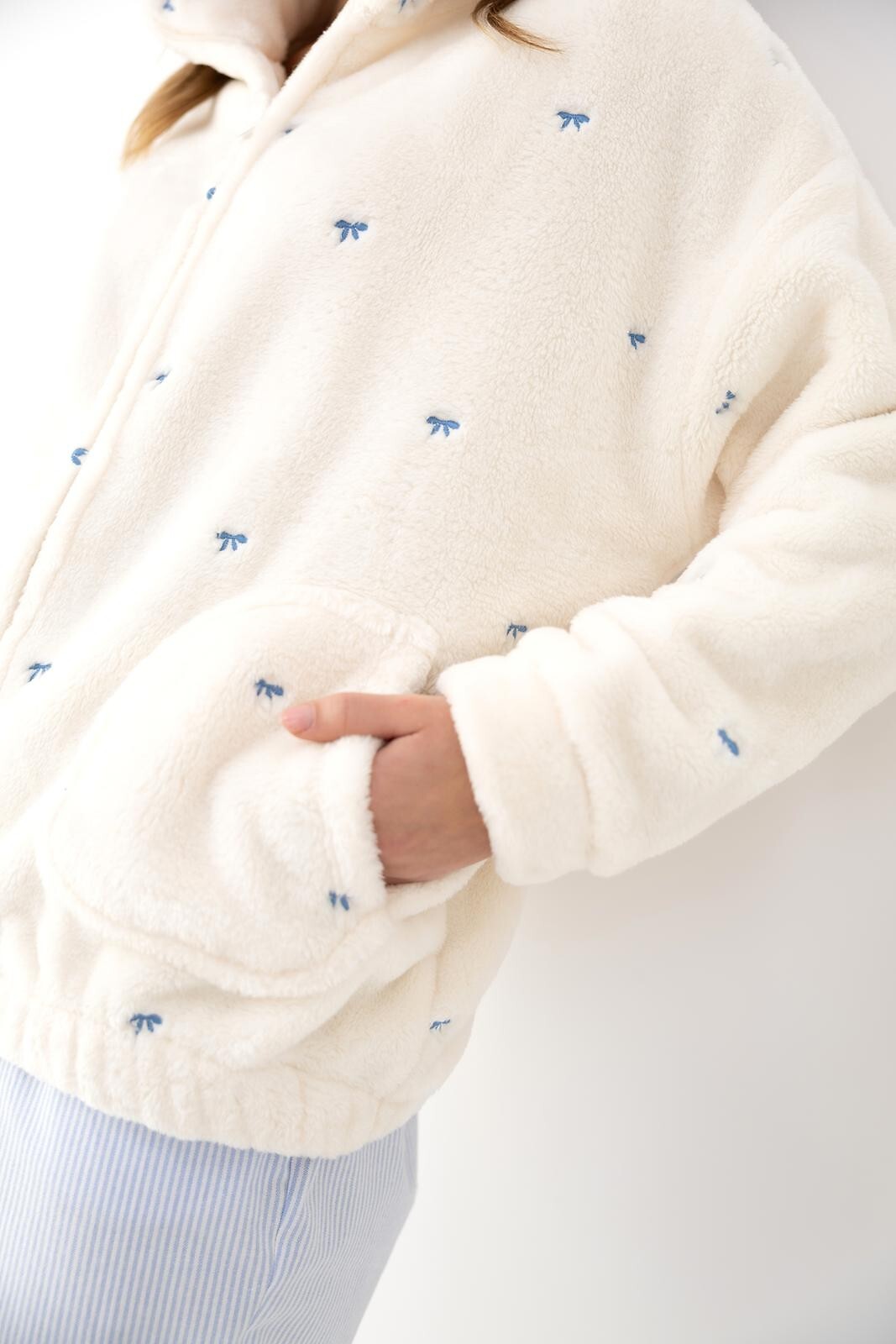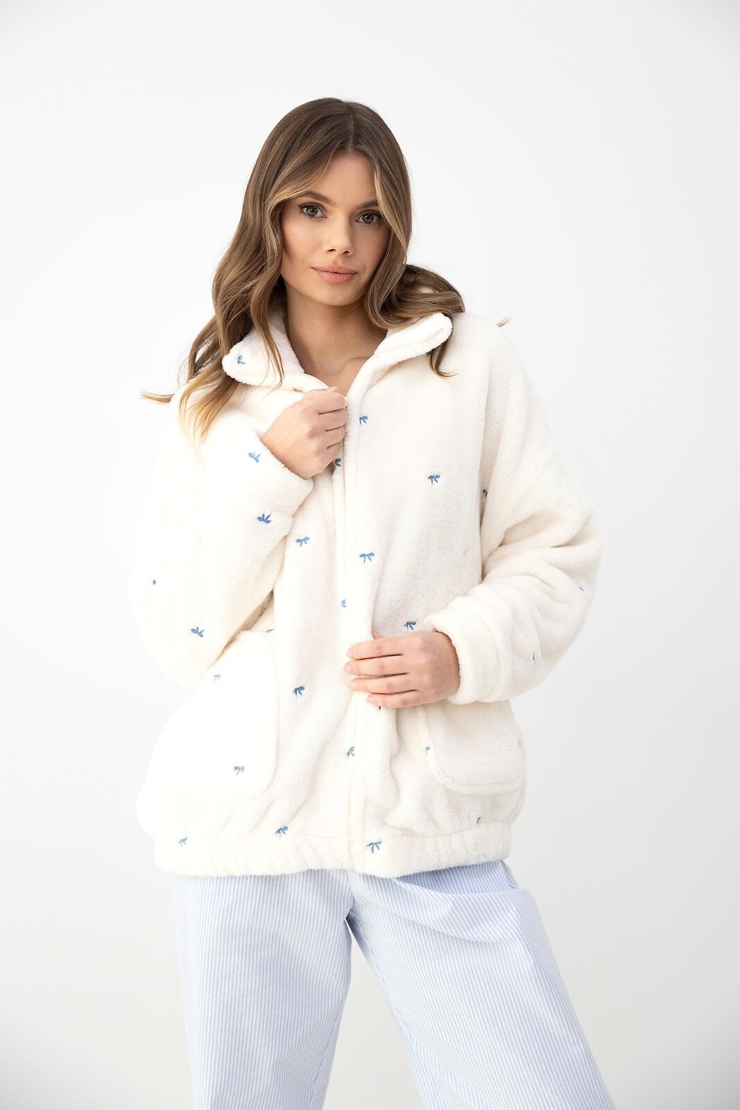 - ozdobiona haftowanymi kokardkami w kolorze niebieskim