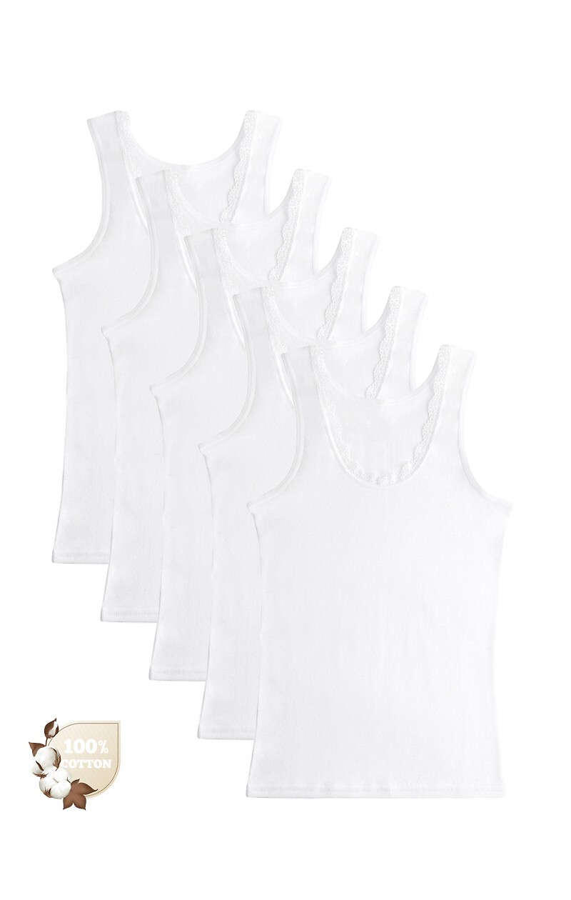 Bawełniana koszulka dziewczęca- szerokie ramiączko- dekolt półokrągły, obszyty koronkową tasiemką- jedna sztuka pakowana w foliowy woreczek