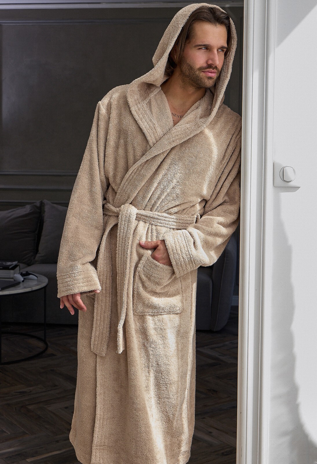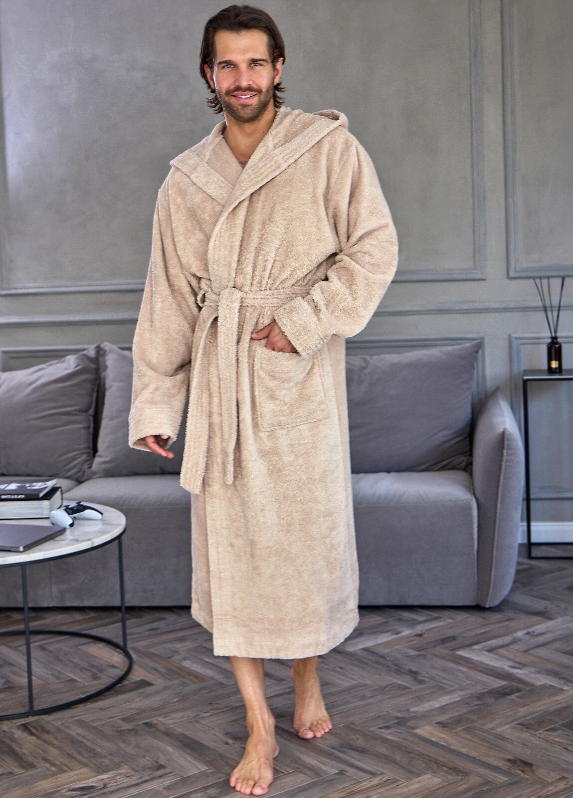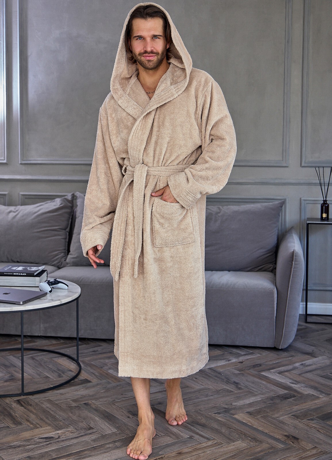 Długi szlafrok męski z kapturem