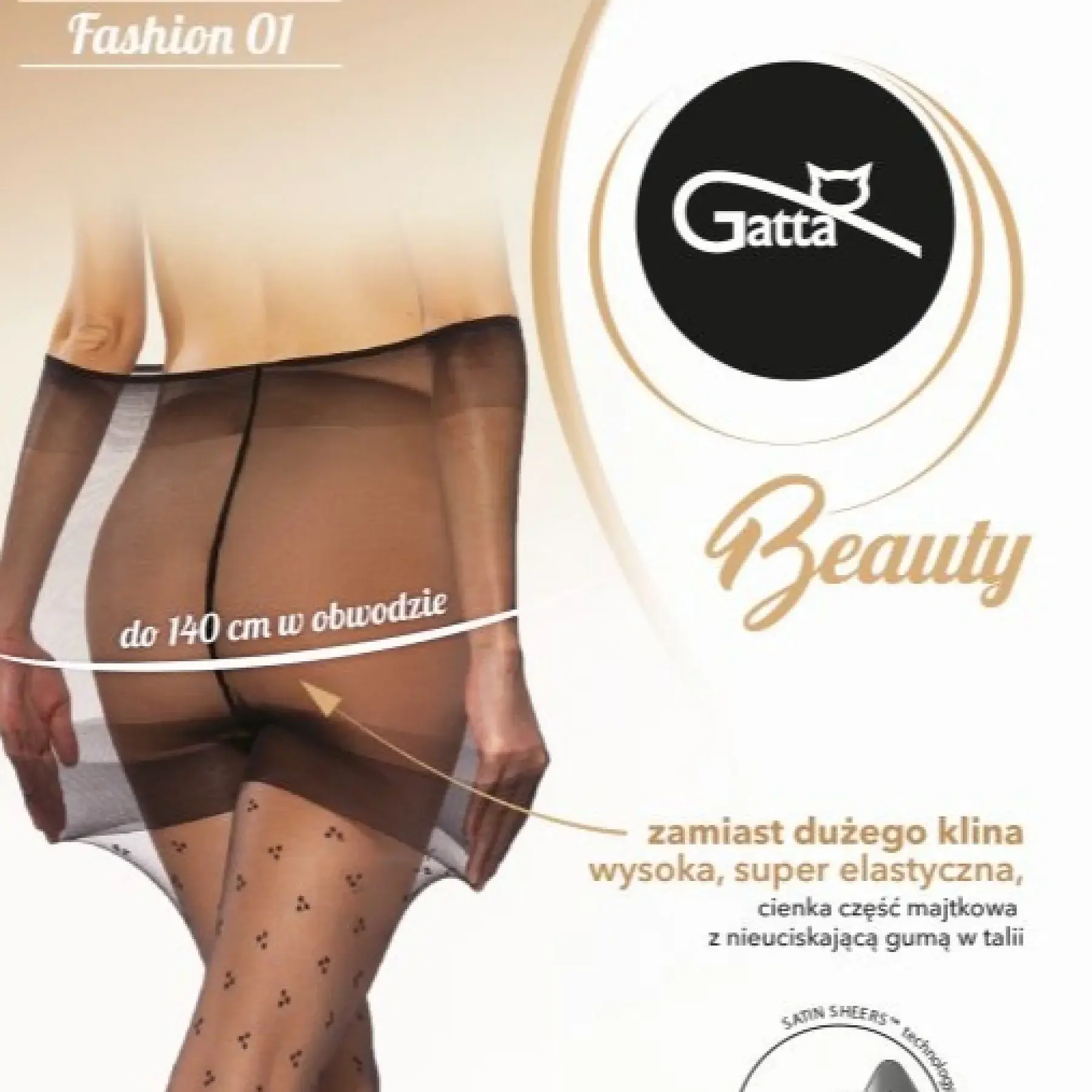 - zamiast dużego klina, wysoka super elastyczna cienka część majtkowa zakończona nieuciskającą gumą o specjalnej konstrukcji, która komfortowo utrzymuje rajstopy w talii i jednocześnie nie ulega zwijaniu